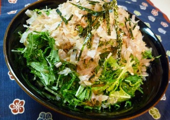 - Transfer the mizuna greens from Step 3 to a plate. Sprinkle with bonito flakes and shredded nori seaweed and swirl in olive oil and soy sauce..
