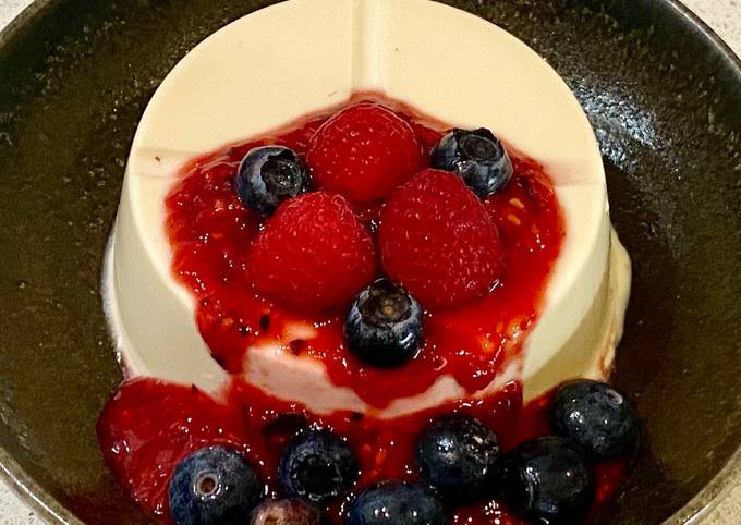 - Then dip each ramekin or small rounded container into a bowl with warm water for 5 seconds. Flip it over onto onto a serving plate or leave in the jars. Drizzle the coulis over the panna cotta, add fresh berries on top and enjoy..